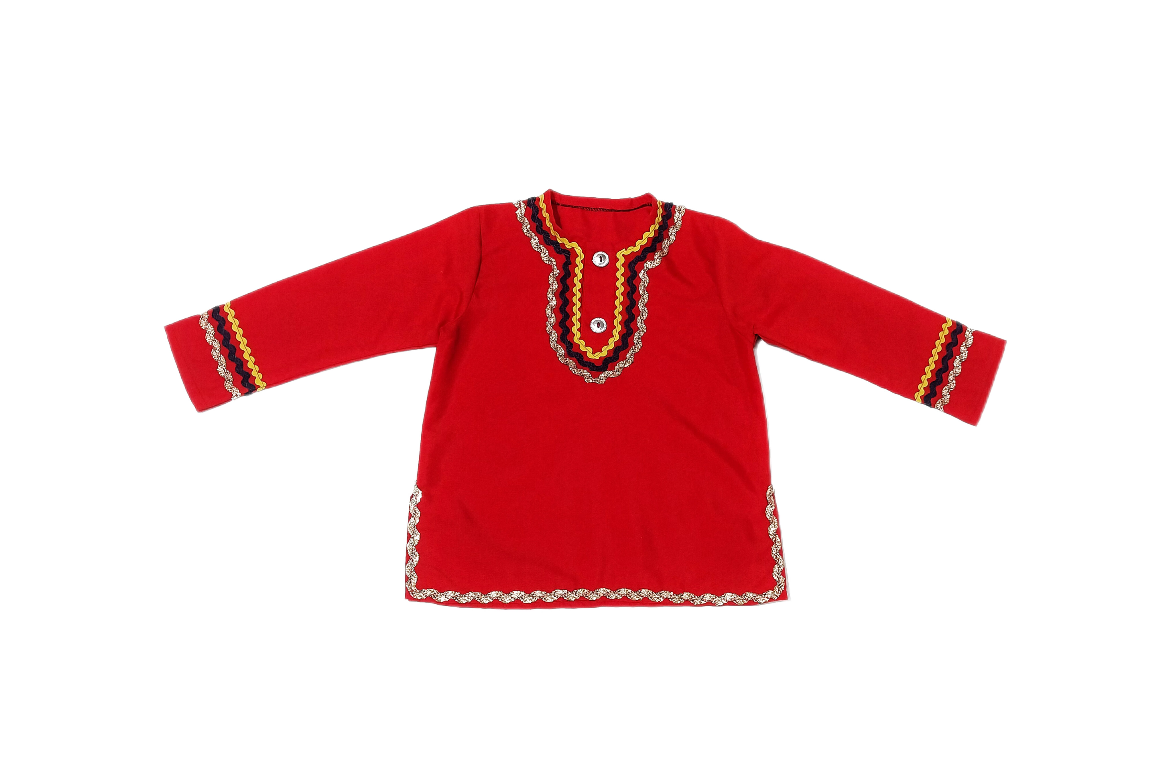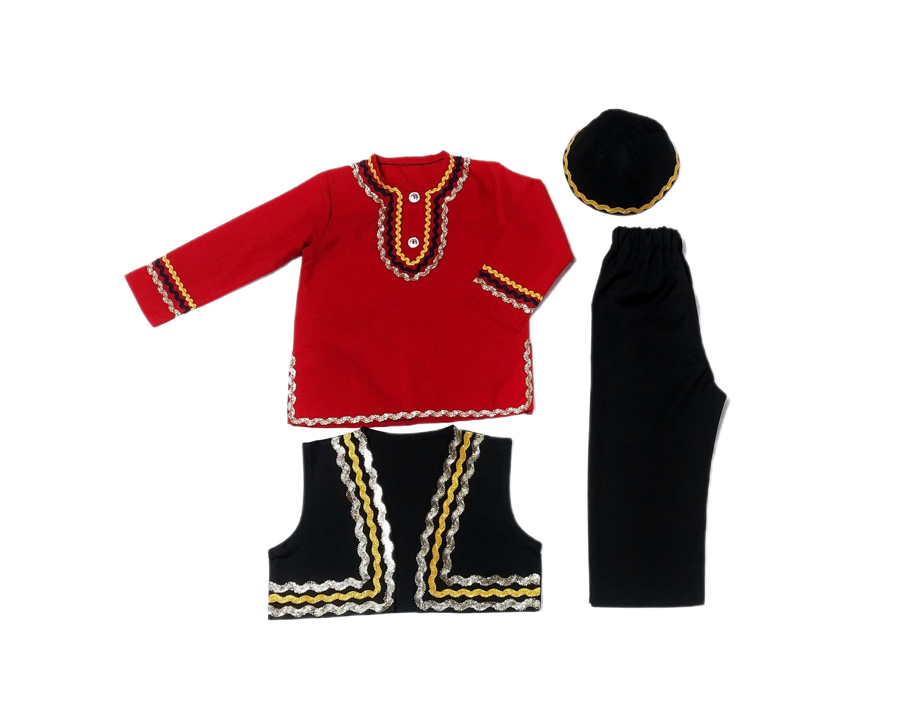 لباس شامل چهار تیکه بلوز و شلوار و جلیقه و کلاه می باشد