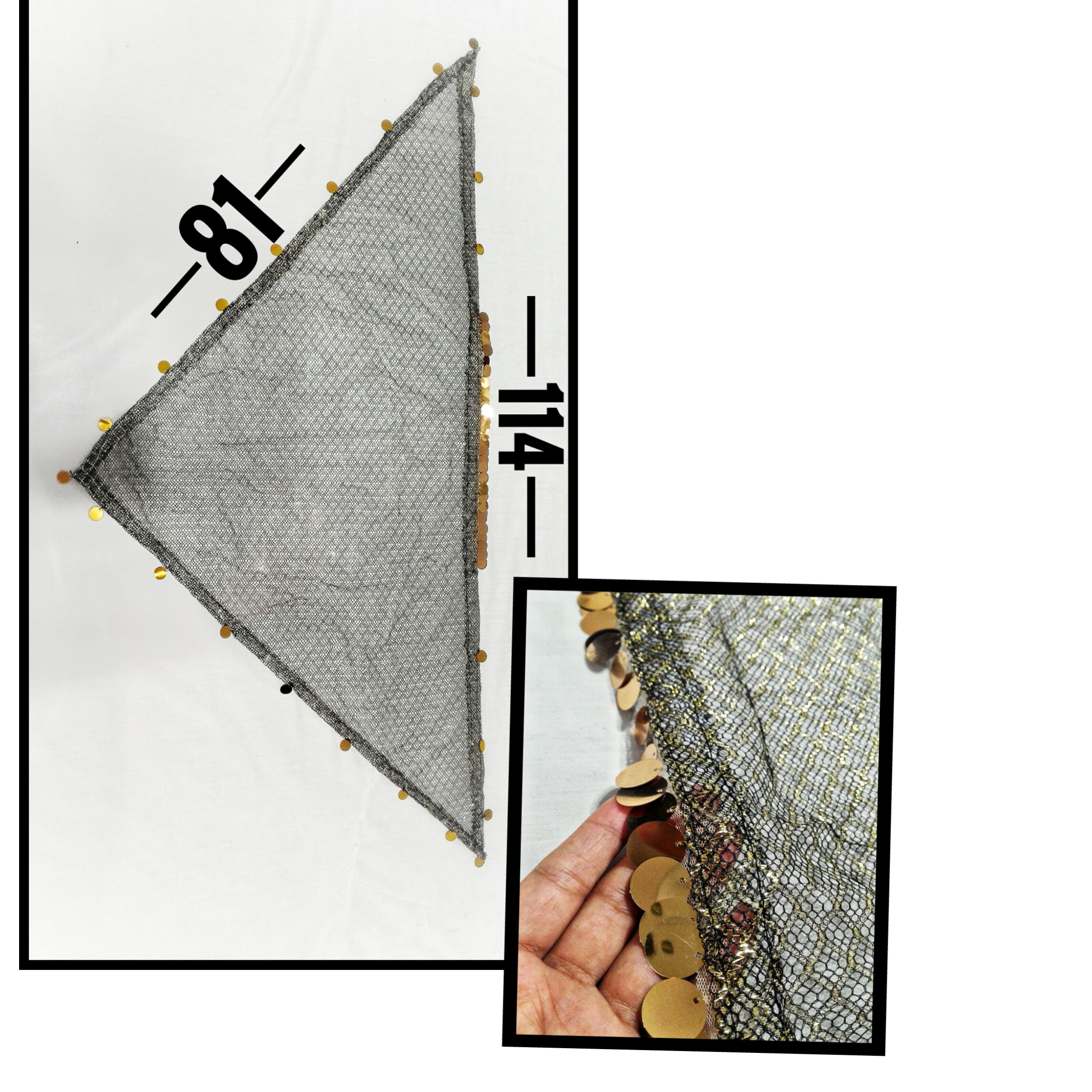 جنس روسری:تور _ رنگ:مشکی و طلایی _ ابعاد به صورت تقریبی: 56*120